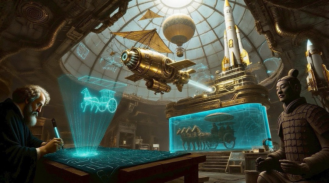 This work centers on the theme of “flight and motion design across time and space,” merging Leonardo da Vinci’s visionary concepts, the craftsmanship of ancient civilizations, and the computational power of future AI within a single scene. On the left, Leonardo symbolizes humanity’s early boundless imagination of flight and dynamics; on the right, the Terracotta Warriors embody Eastern civilization’s pursuit of order, structure, and defense. At the center, a suspended flying machine and rocket represent modern and future technology’s longing for speed, exploration, and the crossing of boundaries.