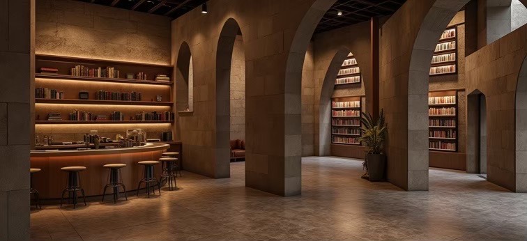 Arc・Boundary is inspired by the mysterious arcades of Hogwarts in Harry Potter, taking the “arch” as its core spatial vocabulary to symbolize passage, transition, and the exploration of knowledge. The space is composed of multiple arched walls forming a walking path, guiding visitors to experience the rhythm of reading through exploration. Functional zones include an area for discussion and exchange, a reading display zone, a café-style bar, and a quiet reading area. Through the use of curves, semicircles, and light-and-shadow arrangements, the bookstore becomes both interactive and contemplative. In the design process, AI text-to-image tools helped transform abstract concepts—“arch,” “mystery,” and “coffee-toned palette”—into concrete visuals, while image-to-image techniques developed simple models into rich visual schemes with texture, lighting, and atmosphere. AI not only accelerated design and provided fresh perspectives but also became a collaborator in spatial imagination, allowing Arc・Boundary to deliver a reading experience imbued with a sense of magic and immersion.