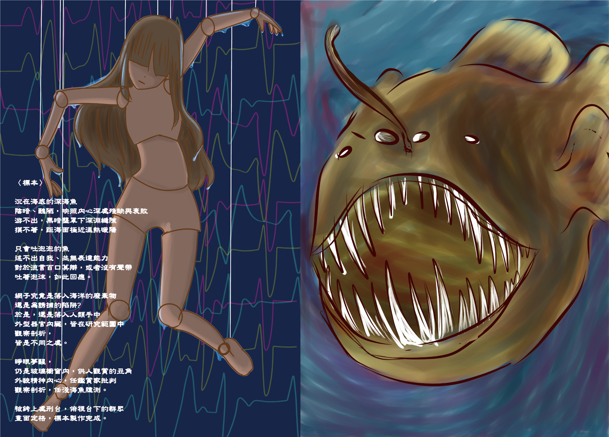 《吶喊。無聲。》本作品以情緒為主題,探索壓抑與釋放之間的張力。人生中歡喜、悲傷、憤怒等情緒雖不可或缺,卻常因社會期待或自我約束而被壓抑。作品以兩幅畫面呈現情緒的對比:一幅描繪壓抑情緒下的平靜外表,泡沫與平緩心電圖象徵表面上的安定;另一幅則呈現情緒潰堤的瞬間,心電圖混亂、面貌扭曲,彷彿內心的波動突破了壓抑的枷鎖。透過紅藍對比、噴濺水紋與心電圖的視覺語彙,作品希望觀者感受到情緒的真實力量,以及壓抑帶來的張力與最終的釋放,提醒人們正視每一份情感,允許它存在與流動。