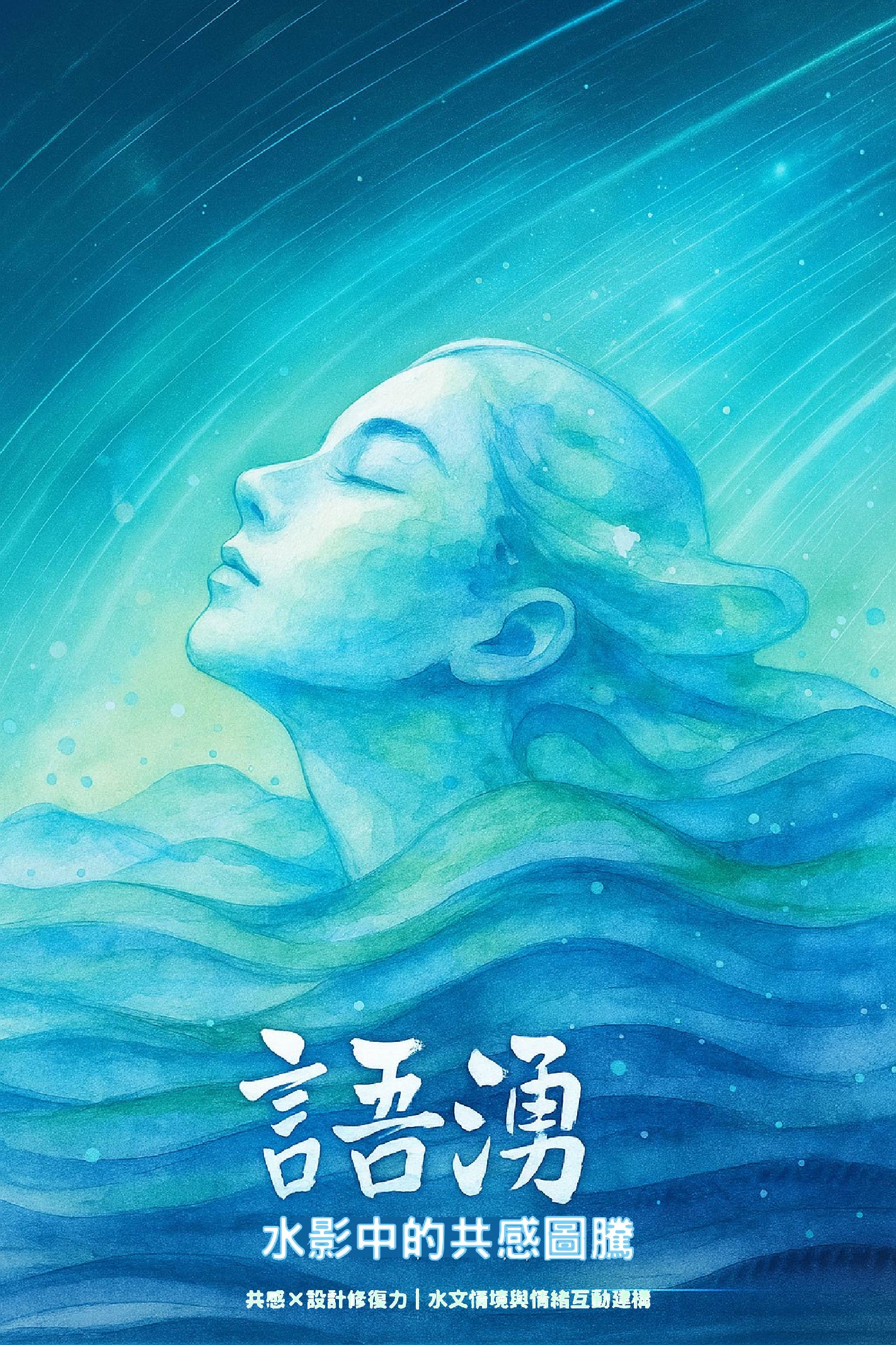 以水作為隱喻,將語言視為流動的情感之河,探索聲音在數位轉譯後能否依舊保留溫度與記憶。作品結合水文療癒、聲紋視覺化與多語文化元素,主視覺中,水中人影與聲波圖騰交織,呼應情感流動與文化交融的主題。原民圖紋的韻律與書法筆觸的氣息,被轉化為獨特的聲紋意象,在視覺上構築出多語共感的符號。媒材上,以水彩的滲化與透明感營造柔和氛圍,疊加數位光影,讓畫面在靜態與動態間呼吸。觀者可透過語音輸入,生成專屬的「語音水文圖騰」,讓科技成為情感共振的橋樑。此作不僅是視覺作品,更是一場跨越語言、文化與科技邊界的沉浸式共感實驗。