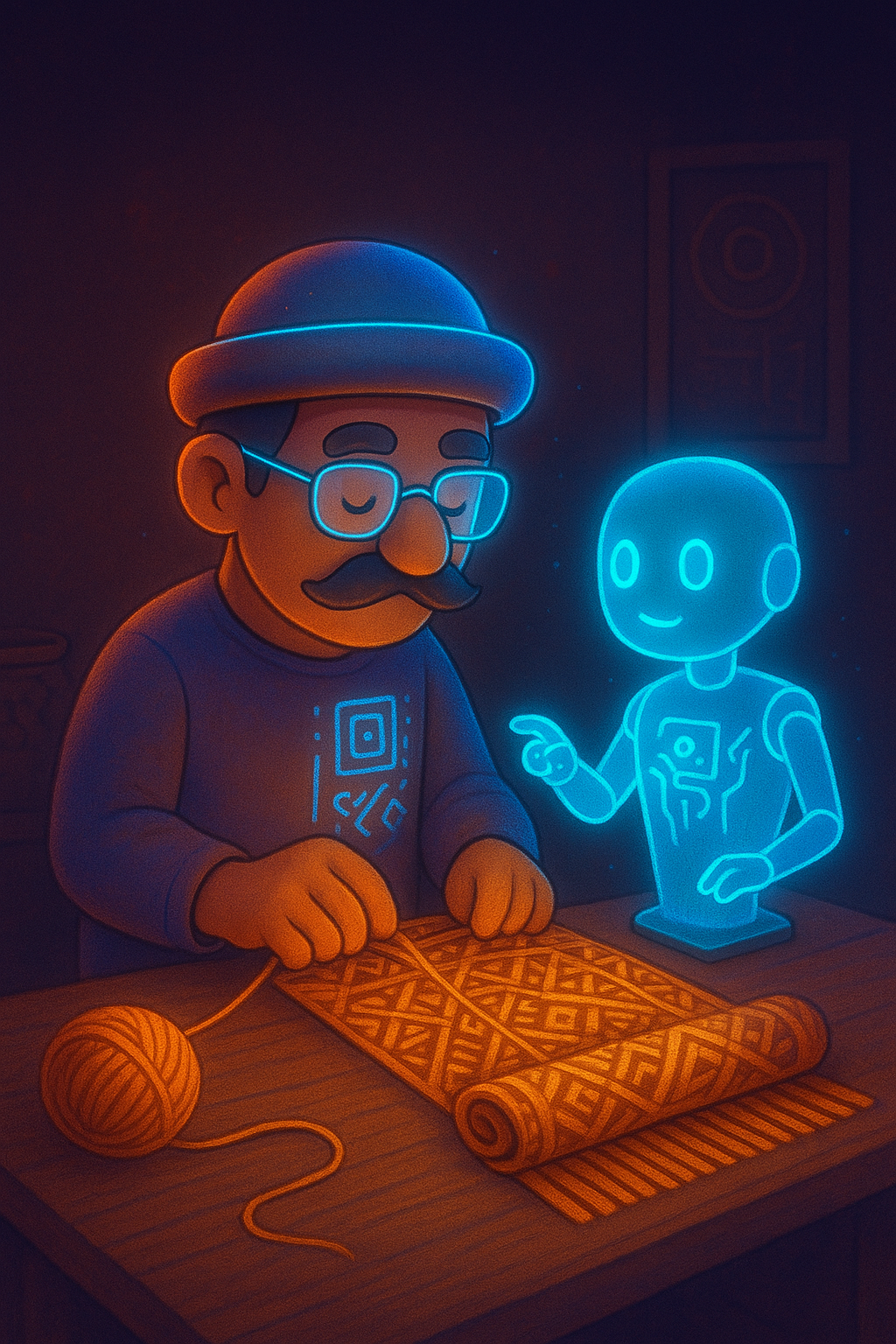 Driven by the global network and AI technologies, distances seem diminished, yet traditional crafts and cultural wisdom face the risk of fragmentation and disappearance. Lumo is imagined as a cross-temporal, world-connecting creative character inspired by the collaborative spirit of Leonardo da Vinci’s workshop. Its form integrates multicultural symbols: the hat signifies global artisans; the calligraphy-pen-shaped nose and beard evoke writing and cultural heritage; its rounded proportions express inclusivity—awaiting viewers to enrich it with their own stories and colors.