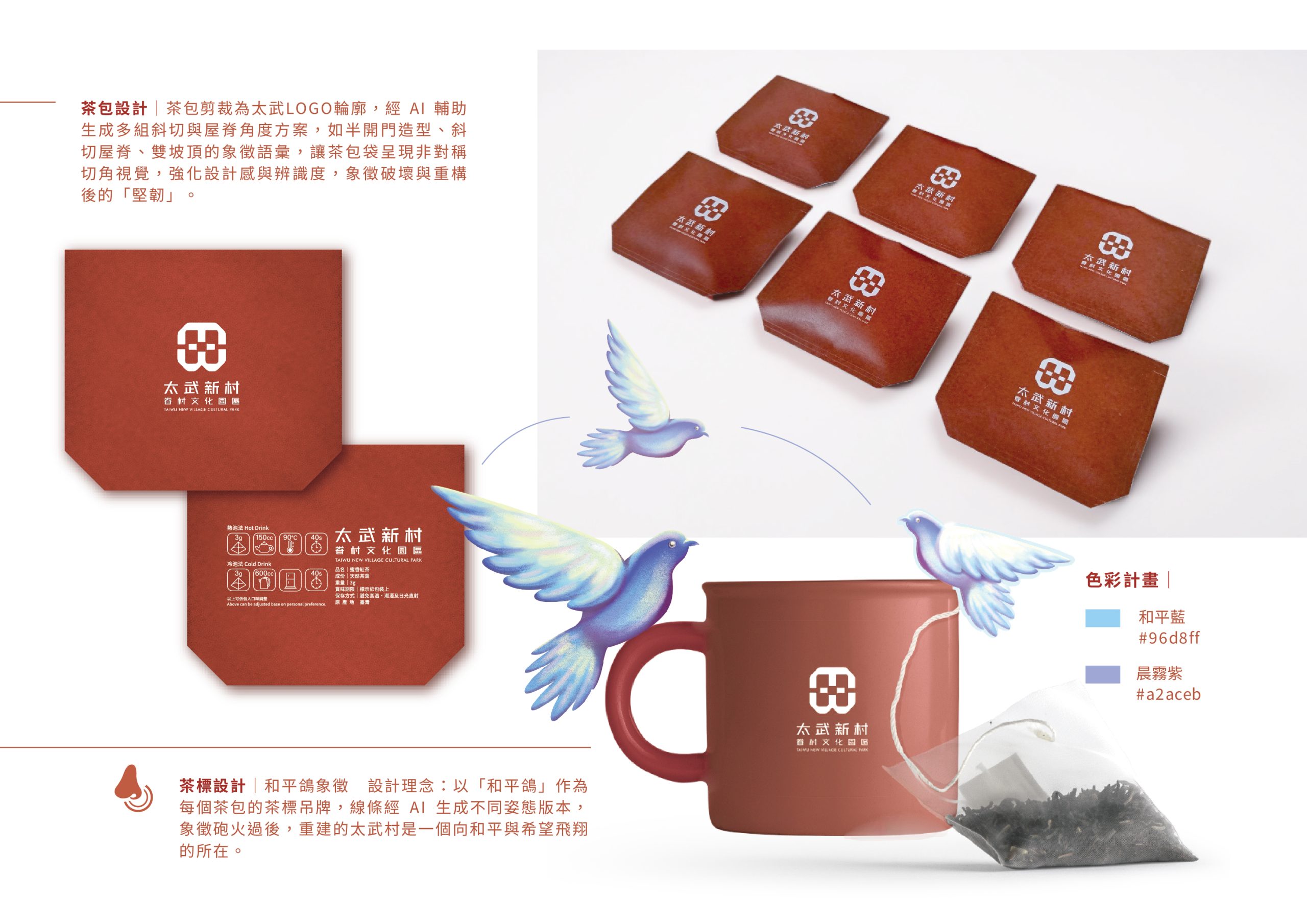 《香氣裡眷村記憶》以桃園龍潭太武新村眷村文化為創作核心,將建築符號、歷史情感與五感體驗轉化為茶包與包裝設計。設計運用紅磚、木門、藍綠窗框等眷村材質與色彩符號,呼應戰後重建的歷史記憶,並以屋型茶包與浮雕紋理呈現建築特徵。產品結合香草野園有機茶款,透過視覺、香氣、觸感與故事卡,打造沉浸式文化體驗;茶盒可模組化組合,重現迷你眷村聚落,增強互動性與收藏價值。設計過程亦融入AI技術,分析建築符號並生成配色、紋理與圖像元素,實現「人工智慧 × 人類設計師」共創模式。此作品不僅是飲品與包裝,更是一種文化再生行動,使太武新村的歷史記憶以現代、跨媒介的方式被感知與延續。