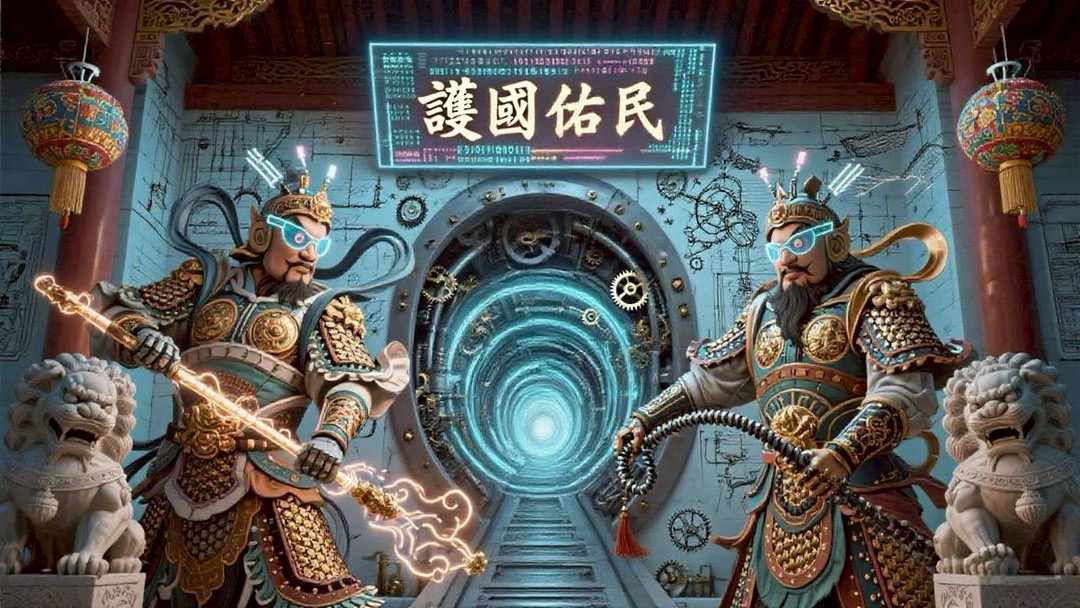 背景以三層時空交疊呈現:全息匾額書寫「護國佑民」,數據瀑布傾瀉;兩側融合達文西機械手稿與中國榫卯結構,象徵東西方智慧並行;中央隧道宛如量子漩渦,引領觀者穿越星空與文明傳承的光暈。整體作品彰顯科技不取代傳統,而是賦予其新生命,讓信念、精神與故事在快速變動的世界中,持續守護人類的文化根脈與精神家園。