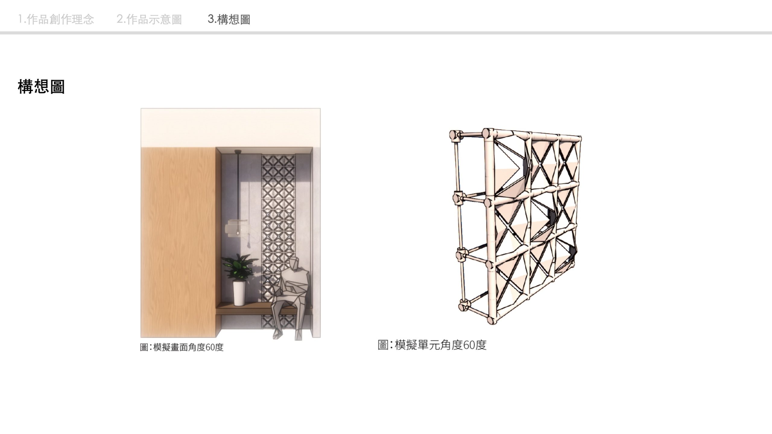 《於牆的對話》重新詮釋牆在空間中的角色,將傳統靜態界線轉化為具備感知、互動與變形能力的動態元素。作品採用模組化設計與3D列印技術,將牆面拆解為可互換、可互動的基本單元,每個單元兼具結構支撐與感測反應功能,能隨使用者行為或環境變化即時回應。透過數位建模與參數化設計,單元造型可高度調整,兼顧列印特性、結構強度與感測元件配置,實現高度靈活的牆面組裝。整體牆面以單元拼接形成多樣幾何與功能變化,不僅突破物理隔間的侷限,也建立與使用者的互動連結。此作品探索建築與科技融合的可能性,讓牆不再只是被動背景,而成為能與人對話、感知環境、啟發想像的空間媒介。