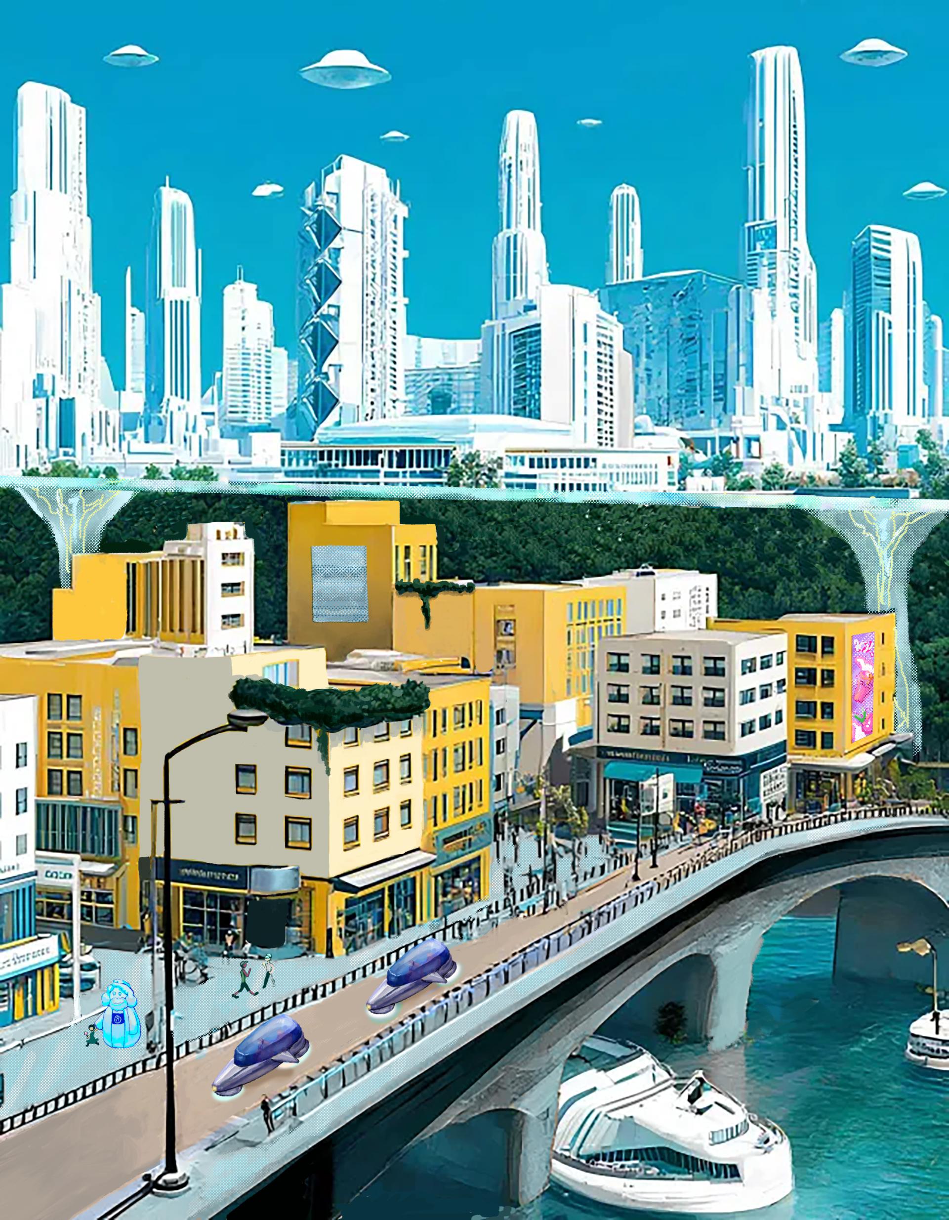 The work preserves da Vinci’s original three-tier planning structure while transforming the aristocratic upper layer into a center for economy and technology. Environmental protection, smart energy, and urban planning are integrated to ensure the city maintains ecological balance amid technological and economic growth. Rendered in a futuristic-retro style, the piece highlights the coexistence of humanistic order and technological innovation, presenting a contemporary vision of an ideal city.