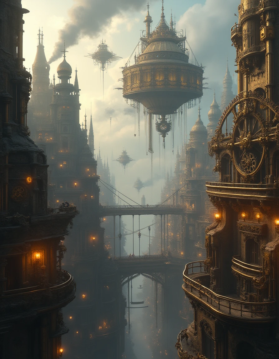 This work adopts a steampunk aesthetic, blending the architectural language of the 19th-century Victorian era with imagined futuristic technology. Floating metal structures, giant gears intertwined with pipes, and the orange-yellow glow of lamps evoke the atmosphere of historical oil lamps and steam machinery, creating a sense of temporal depth. Cooler-toned mist adds mystery and distance, heightening the work’s fantastical tension. Suspended bridges and platforms unfold the city like a three-dimensional labyrinth, as if one has stepped into a space where history and future merge—frozen in the Industrial Revolution yet simultaneously entering a realm of technological imagination.